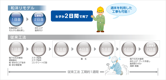 和洋リモデル工法とはTOTOのオリジナル工法です。和式トイレをリモデルし、最新の洋式トイレへと交換する工事です。現在オフィスや学校、病院など数多くの場所で施工されています。工期がわずか2日で終わるスピーディさが大きな特徴です。もちろん大手メーカーが勧める工法ですので信頼性も高く、丁寧に作業に取り掛かりますので必ずご満足いただける仕上がりとなります。「和式のトイレが使いにくい…けれどトイレが使えないと困る」といった方は一度ご相談ください。